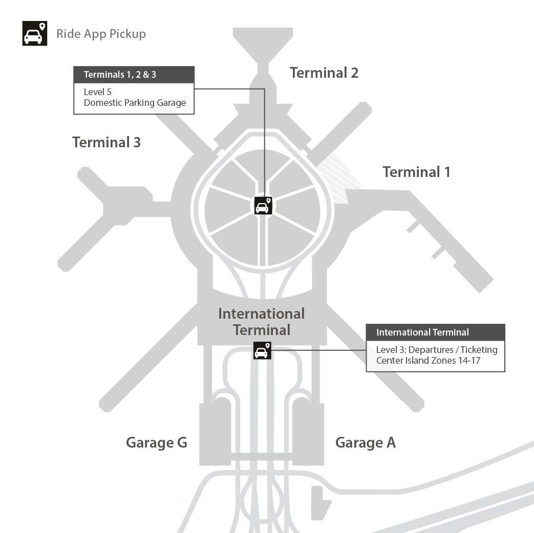 At the International Terminal, Lyft, Uber, and Wingz pick-ups are located at the Departures/Ticketing Level roadway center island, at Pick-Up/Drop-Off zones 14-17.